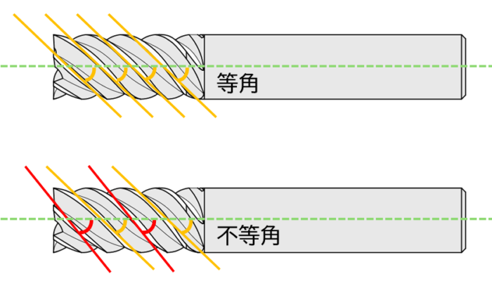 不等リードは、刃のねじれ角を隣の刃と変える設計で、切削のタイミングをずらし、振動が集中するのを避ける。